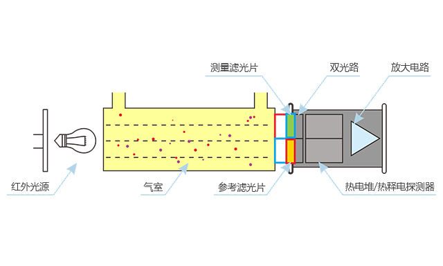 雙光束紅外(NDIR)是基于光源和探測(cè)器制造工藝的改進(jìn)而產(chǎn)生的新一代紅外測(cè)量方法,有別于傳統(tǒng)的非分光紅外(NDIR),雙光束紅外使用電調(diào)制光源方式,探測(cè)器上集成參考和測(cè)量通道,整體實(shí)現(xiàn)雙通道檢測(cè)。由于探測(cè)器良好一致性,測(cè)量通道對(duì)分析物質(zhì)的存在和濃度非常敏感,而參考通道信號(hào)幾乎不受影響。通過(guò)測(cè)量和參考信號(hào)的處理,即使在惡劣的溫度和環(huán)境條件下,也能獲得穩(wěn)定可靠的測(cè)量結(jié)果,解決了不同氣體之間的交叉干擾、高低溫效應(yīng)、濕度效應(yīng)和組分噪聲效應(yīng)等問(wèn)題。