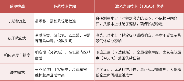 相比傳統(tǒng)的冷鏡法、電容法、氧化鋁法等,可調(diào)諧半導(dǎo)體激光吸收光譜技術(shù)實現(xiàn)了質(zhì)的飛躍: