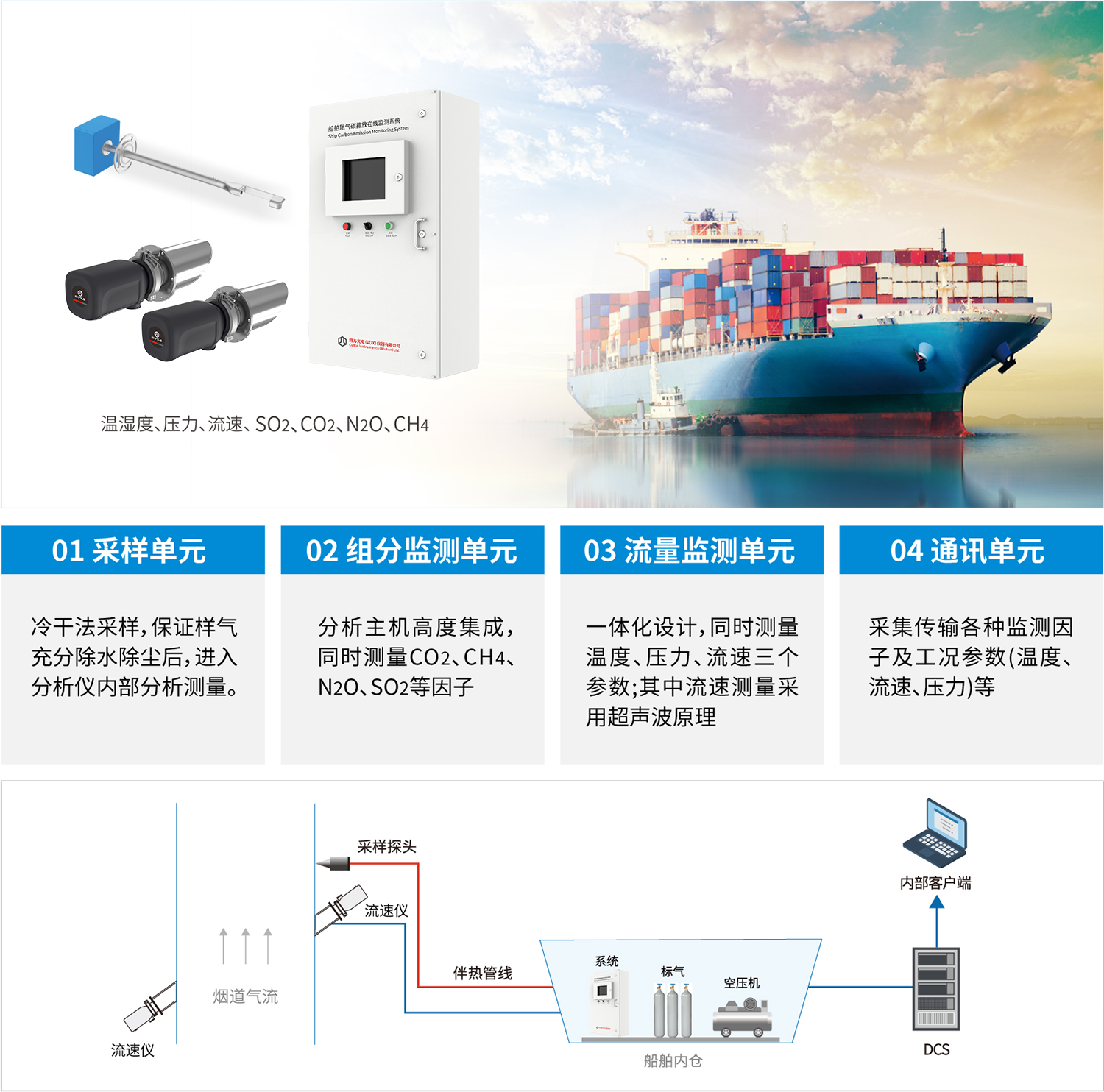 針對客戶的監(jiān)測需求,四方儀器為其量身定制開發(fā)了船舶尾氣碳排放在線監(jiān)測解決方案,這是一套完全抽取式船舶尾氣排放連續(xù)監(jiān)測系統(tǒng)(Gasboard-9085),除常規(guī)SO2、CO2監(jiān)測模式以外,通過增加碳監(jiān)測和溫壓流模塊,以及多種技術(shù)聯(lián)合監(jiān)測、多種算法組合模擬、多種手段協(xié)同管理的技術(shù)手段,可同步監(jiān)測煙氣中CH4、N2O濃度以及溫壓流等參數(shù),同步計算SO2/CO2比值、污染物排放速率和排放量,生成濃度值對應(yīng)的干基、濕基濃度,實現(xiàn)船舶尾氣實時監(jiān)控、實時上傳、智慧管理的目標(biāo)。其監(jiān)測方法原理及性能滿足相關(guān)國際公約要求(NTC-2008、MEPC.259(68)等)。此外,該系統(tǒng)經(jīng)過特殊的防腐處理、防震設(shè)計、結(jié)構(gòu)設(shè)計等,能夠適應(yīng)航運過程中的惡劣環(huán)境。
