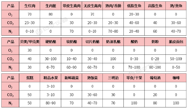 常見食品所用氣調(diào)包裝的頂空氣體混合比例(單位%)