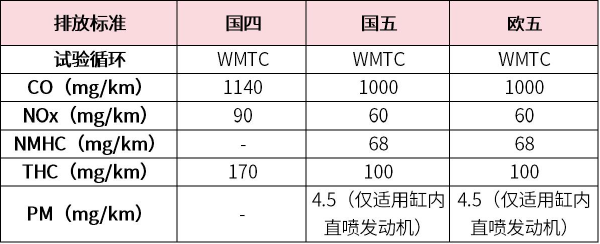 1 摩托車(chē)國(guó)四、國(guó)五和歐五排放標(biāo)準(zhǔn)的I型試驗(yàn)排放限值(裝用點(diǎn)燃式發(fā)動(dòng)機(jī)的第二類(lèi)摩托車(chē))
