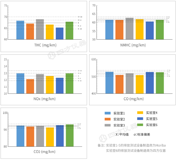 2024年由某國(guó)家級(jí)摩托車(chē)排放質(zhì)檢中心聯(lián)合5個(gè)大型摩托車(chē)企業(yè)開(kāi)展了6個(gè)摩托車(chē)排放實(shí)驗(yàn)室間的比對(duì)試驗(yàn)。其中,5個(gè)排放實(shí)驗(yàn)室均使用了國(guó)際知名制造商Horiba公司生產(chǎn)的全流稀釋排放測(cè)試系統(tǒng),另外1個(gè)排放試驗(yàn)室使用了四方儀器生產(chǎn)的全流稀釋排放測(cè)試系統(tǒng)。本次比對(duì)試驗(yàn)使用了同一輛2-1類(lèi)兩輪摩托車(chē)樣車(chē)。各實(shí)驗(yàn)室嚴(yán)格按照(EU)No 134/2014(歐五)標(biāo)準(zhǔn)要求完成常溫下冷啟動(dòng)后排氣污染物排放試驗(yàn)(I型試驗(yàn))。比對(duì)試驗(yàn)結(jié)果顯示所有參比實(shí)驗(yàn)室各污染物組分的平均值在標(biāo)準(zhǔn)偏差的±2σ以內(nèi)(圖2),表明各實(shí)驗(yàn)室試驗(yàn)結(jié)果的一致性較好。同時(shí),本次比對(duì)試驗(yàn)結(jié)果及結(jié)論充分表明:四方儀器全流稀釋排放測(cè)試系統(tǒng)CVS不僅完全符合摩托車(chē)歐五及國(guó)五標(biāo)準(zhǔn)技術(shù)要求,其實(shí)際性能水平也已經(jīng)與國(guó)際主流品牌產(chǎn)品相當(dāng)。