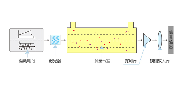 可調(diào)諧半導(dǎo)體激光吸收光譜法(TDLAS),是利用半導(dǎo)體激光器的波長調(diào)諧特性和待測氣體對激光的選擇性吸收進(jìn)行氣體濃度檢測的一種技術(shù)。具有高靈敏度、實(shí)時、動態(tài)、多組分同時測量的優(yōu)點(diǎn)。其原理是可調(diào)諧半導(dǎo)體激光器在驅(qū)動電流的調(diào)制下,發(fā)射出特定波長的激光,隨著注入周期性電流的調(diào)制,激光波長產(chǎn)生周期性變化,使激光中心波長調(diào)節(jié)到待測氣體的吸收譜線,發(fā)生選擇性吸收,再利用經(jīng)過氣體吸收得到的光譜強(qiáng)度信號反演出待測氣體的濃度。因?yàn)榘雽?dǎo)體激光器的高單色性,可以利用待測氣體分子的一條孤立的吸收譜線進(jìn)行測量,避免了不同分子光譜的交叉干擾,從而準(zhǔn)確的鑒別出待測氣體。