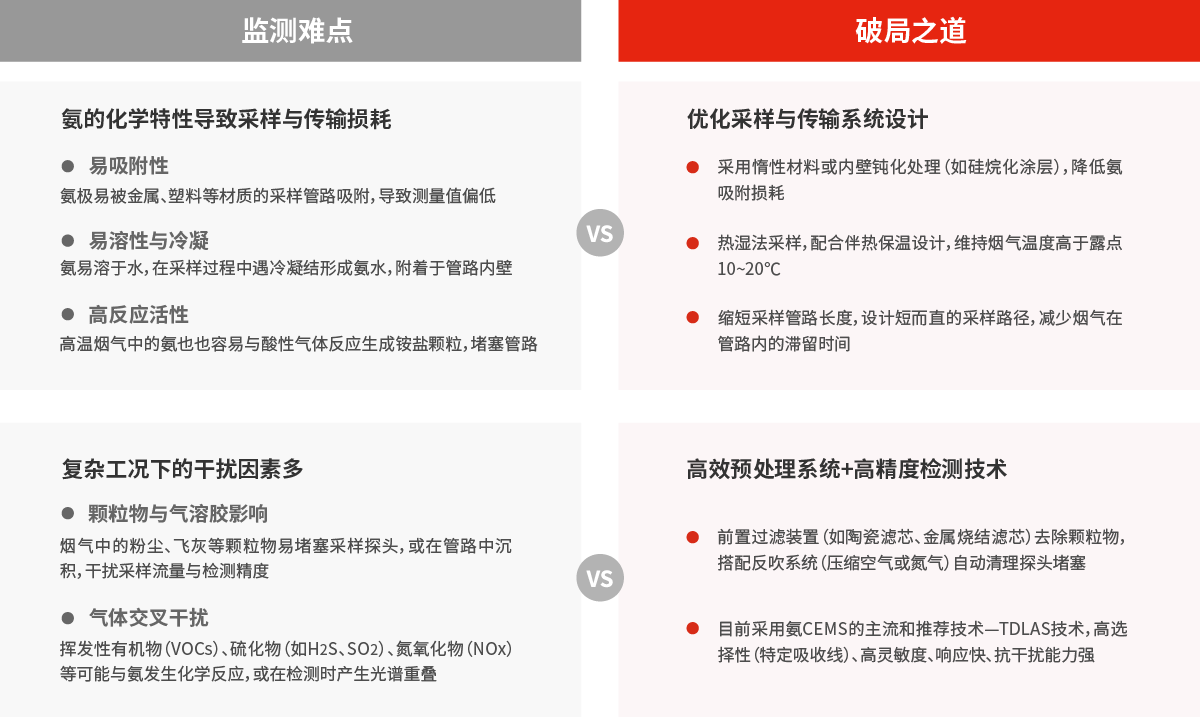 固定污染源氨逃逸在線監(jiān)測(cè)的核心難點(diǎn)源于氨自身的高水溶性、強(qiáng)吸附性與反應(yīng)活性,以及復(fù)雜惡劣的煙氣環(huán)境(高溫、高濕、高粉塵、酸性氣體共存)。這導(dǎo)致在樣品采集與傳輸過程中極易發(fā)生氨溶解于冷凝水、吸附于管路部件、或與酸性氣體反應(yīng)生成銨鹽而損失,造成測(cè)量值偏低和響應(yīng)延遲。同時(shí),環(huán)保法規(guī)要求的ppm級(jí)超低濃度測(cè)量需求,對(duì)分析技術(shù)的靈敏度、選擇性和抗干擾能力提出了極高挑戰(zhàn)。