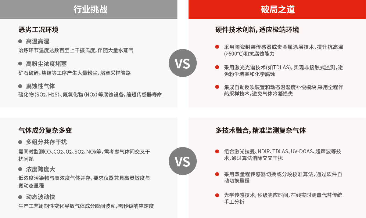 在鋼鐵行業(yè),復(fù)雜的工況環(huán)境給氣體監(jiān)測(cè)帶來(lái)了諸多嚴(yán)峻挑戰(zhàn)。高溫高濕、高腐蝕、高粉塵濃度以及氣體交叉干擾等問(wèn)題,不僅影響監(jiān)測(cè)設(shè)備的穩(wěn)定性和準(zhǔn)確性,還增加了維護(hù)成本和安全風(fēng)險(xiǎn)。面對(duì)這些行業(yè)難題,四方光電(武漢)儀器有限公司(以下簡(jiǎn)稱“四方儀器”)憑借先進(jìn)的自主技術(shù)與創(chuàng)新的解決方案,成功突破傳統(tǒng)監(jiān)測(cè)的瓶頸,為工業(yè)氣體監(jiān)測(cè)提供了高效、精準(zhǔn)、可靠的破局之道。