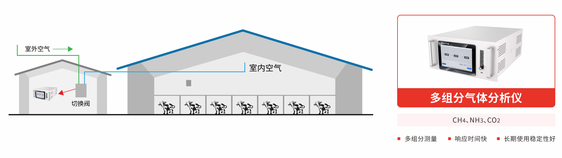 在線氣體分析儀可集成于位于畜舍外固定式監(jiān)測站房內(nèi)部,分析儀設(shè)置場外(環(huán)境空氣)和場內(nèi)(畜舍內(nèi)部)兩個獨立進樣口,通過三通電磁閥自動實現(xiàn)氣源切換,在線測量場內(nèi)和場外CH4、CO2,NH3等濃度,實時掌握養(yǎng)殖場環(huán)境信息,保障畜禽健康生長,同時為溫室氣體排放量核算提供準(zhǔn)備的數(shù)據(jù)支撐。
